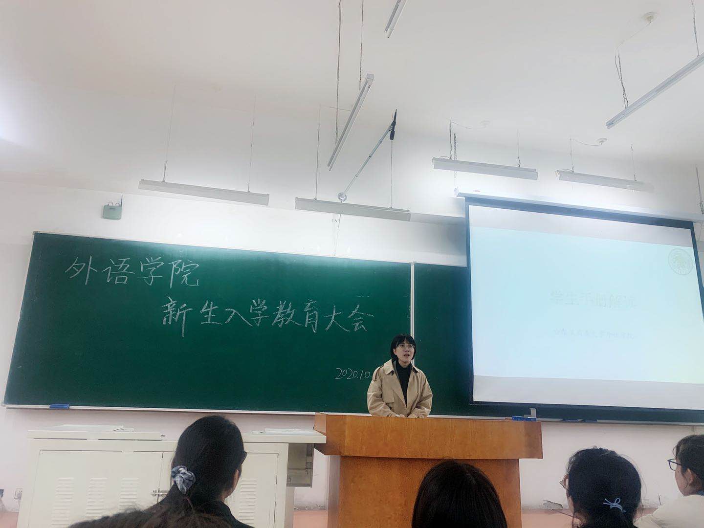 10月4日下午,外语学院在4206举行新生入学教育大会,外语学院党委书记刘天老师与2020级辅导员朱晓慧老师及2020级全体新生及2018级学生干部共计260余人参加会议。