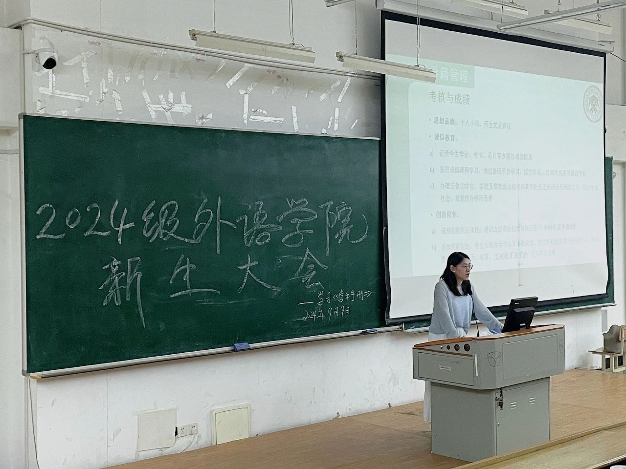 为更好地让2024级新同学了解学校规章制度,尽快适应大学生活,2024年9月9日,外语学院召开2024级新生教育大会,集中学习《学生手册》。外语学院2024级全体新生参与此次会议,会议由新生辅导员孙志鸿主持。