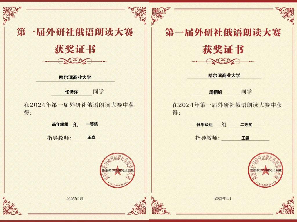 近日,第一届外研社俄语朗读大赛落下帷幕,我校外语学院俄语专业2021级学生佟诗洋、2022级学生周桐旭在王淼老师的指导下分别获得高年级组一等奖、低年级组二等奖的优异成绩,为学校争得了荣誉。