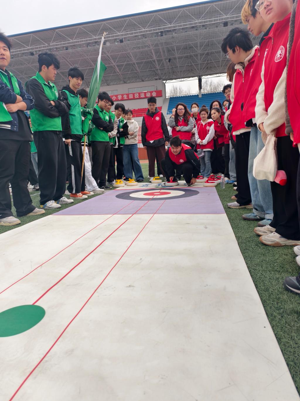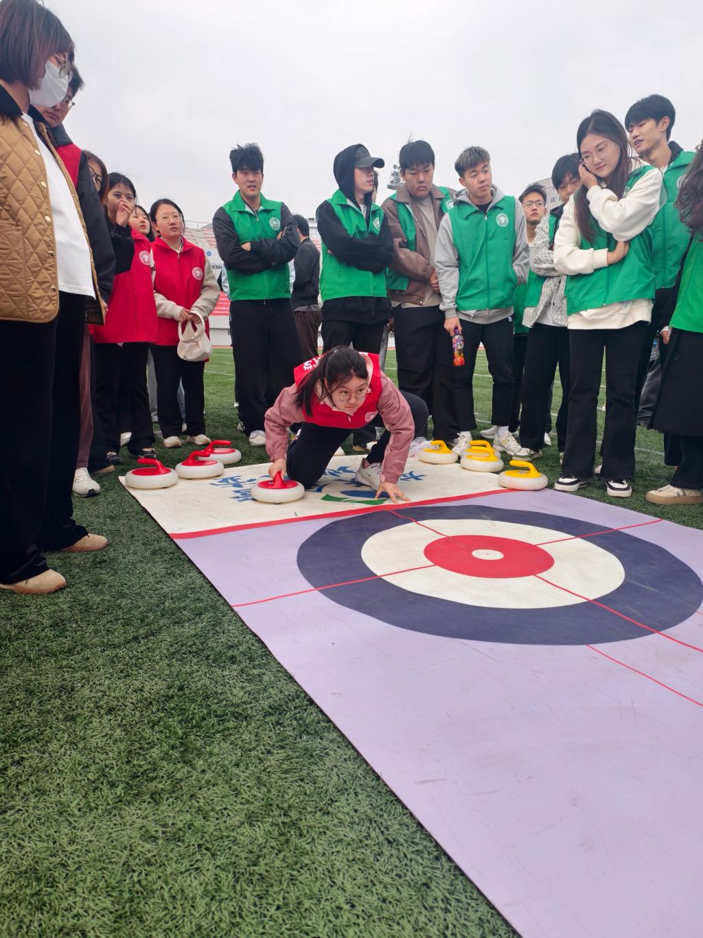 接下来,32名同学分为4组,每组8名选手,4名组长分别与组员们商讨比赛策略,合理安排选手上场顺序。在教练的安排下,外语学院与能源与建筑工程学院开始正式比赛,逐队比拼。在比赛过程中,选手们手握冰壶,眼神专注地瞄准目标,放手一推,所有人都屏住呼吸,注视着冰壶的走向。每一次冰壶的碰撞,都伴随着同学们的欢呼声。中场休息时,组长带着组员复盘,观察对手动向,及时调整战术,在后续比赛中,外语学院选手们热情高涨,配合默契,将比赛推向高潮。