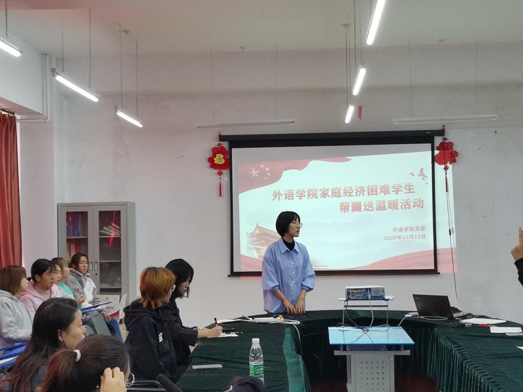 11月13日,外语学院在主楼0505举行了学院帮困送温暖活动,外语学院 2018级辅导员王佳丽老师,2017级、2019级辅导员孙志鸿老师,2020级辅导员朱晓慧老师,2020-2021年度25名家庭经济困难学生代表及2020级新生代表参加此次活动。