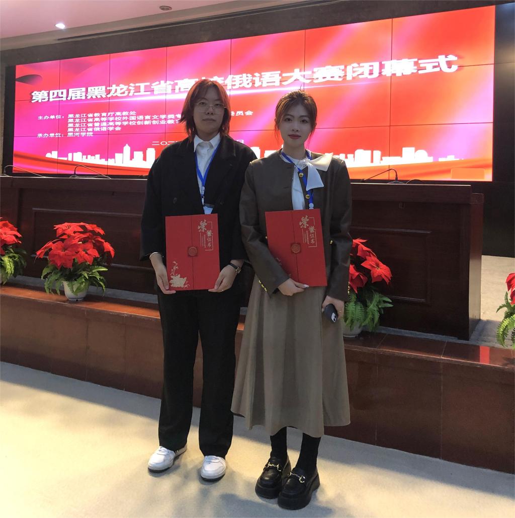 2023年9月23日至24日,第四届黑龙江省高校俄语大赛于黑河学院成功举办。我院2021级俄语专业学生佟诗洋以总分第4名的成绩荣获高校高年级组二等奖,2022级俄语专业学生梁佳琪荣获单项比赛三等奖。
