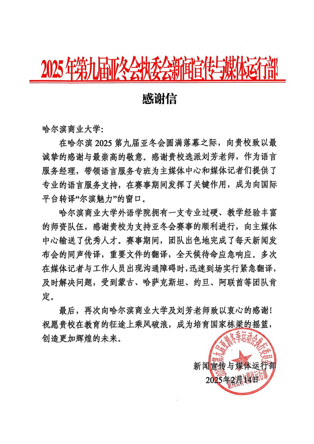 2025年2月7日至14日,第九届亚洲冬季运动会在哈尔滨成功举办。在这场国际冰雪盛事中,哈尔滨商业大学外语学院积极响应号召,选派了3名教师和9名学生志愿者投身于亚冬会的语言服务、票务管理、媒体运行等多个岗位,以专业素养展现商大风采,为国际赛事的顺利举办贡献青春力量。