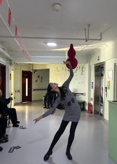 文艺互动环节为整场活动注入澎湃活力,成功将氛围推向高潮。志愿者与老人们默契十足,老人端坐电子琴前,指尖轻跃奏出悠扬乐章,学生们轻声伴唱,乐声与歌声交织萦绕,携手唱响《没有共产党就没有新中国》《让我们荡起双桨》等经典曲目,随后,2025级孟垚伊同学为老人们带来民族舞表演,本次活动暖意融融,将彼此的心意酿成最动人的温情。